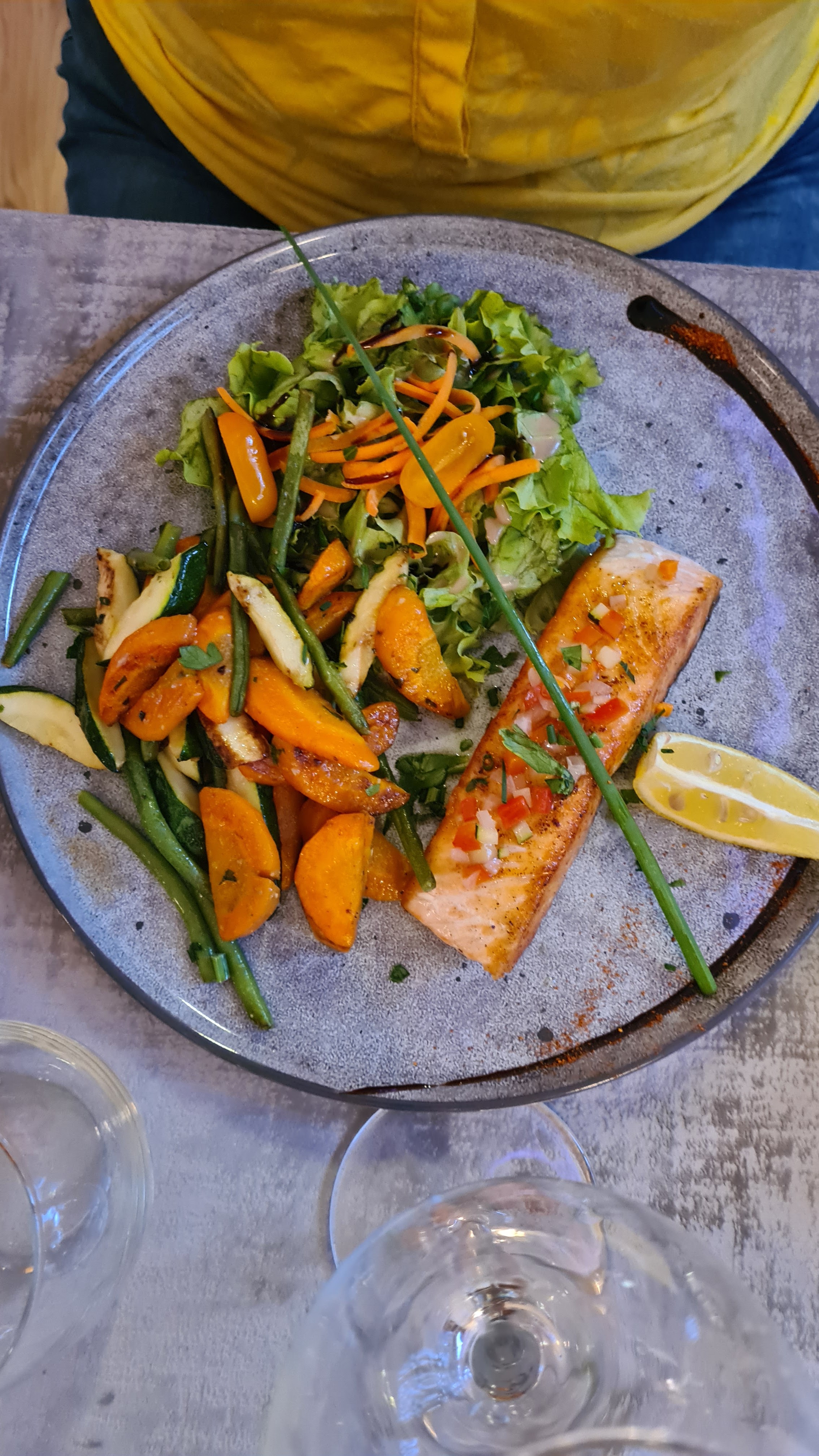 Les plats sont frais et bons. Je n’ai pas apprécié l’ambiance du dîner car il y avait trop de lumière et ce n’était pas cozy.
