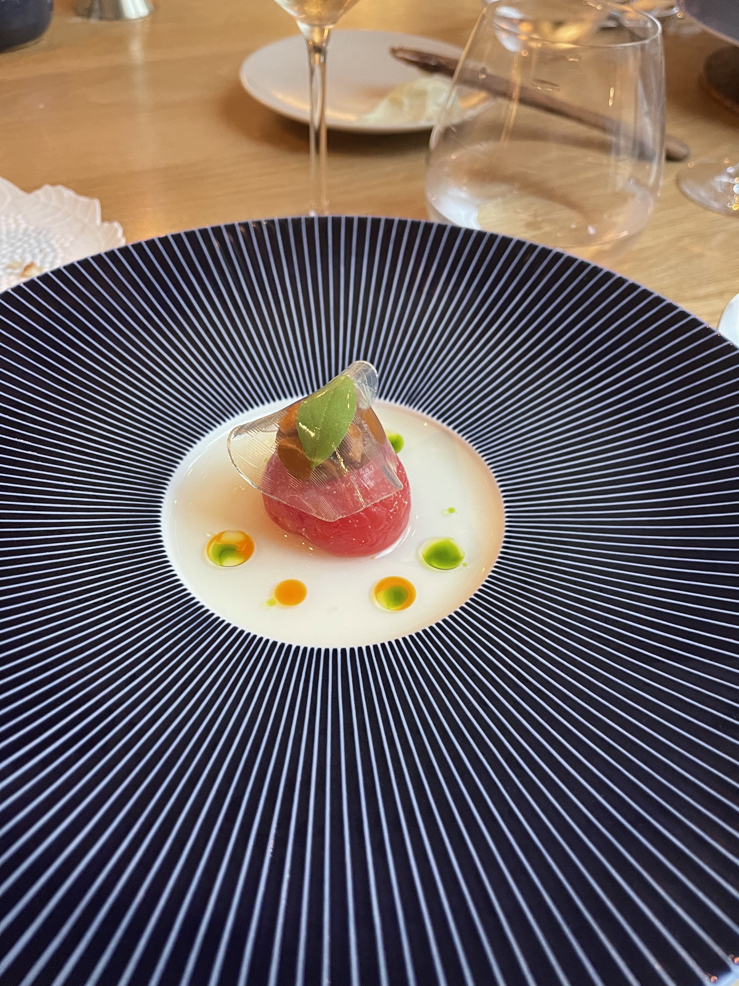 Le lieu est superbe. Les produits sont délicieux et les cuissons parfaites. Qq bémols, parfois bien trop d'informations dans l'assiette, on s'y perd (par ex le homard avec 3 sauces différentes). Venir avec une truffe sous cloche en nous disant que c'est délicieux (je confirme) est et que ça engendre un supplément de 25€, ce n'est pas agréable. Enfin le service est très efficace, un peu stressé.