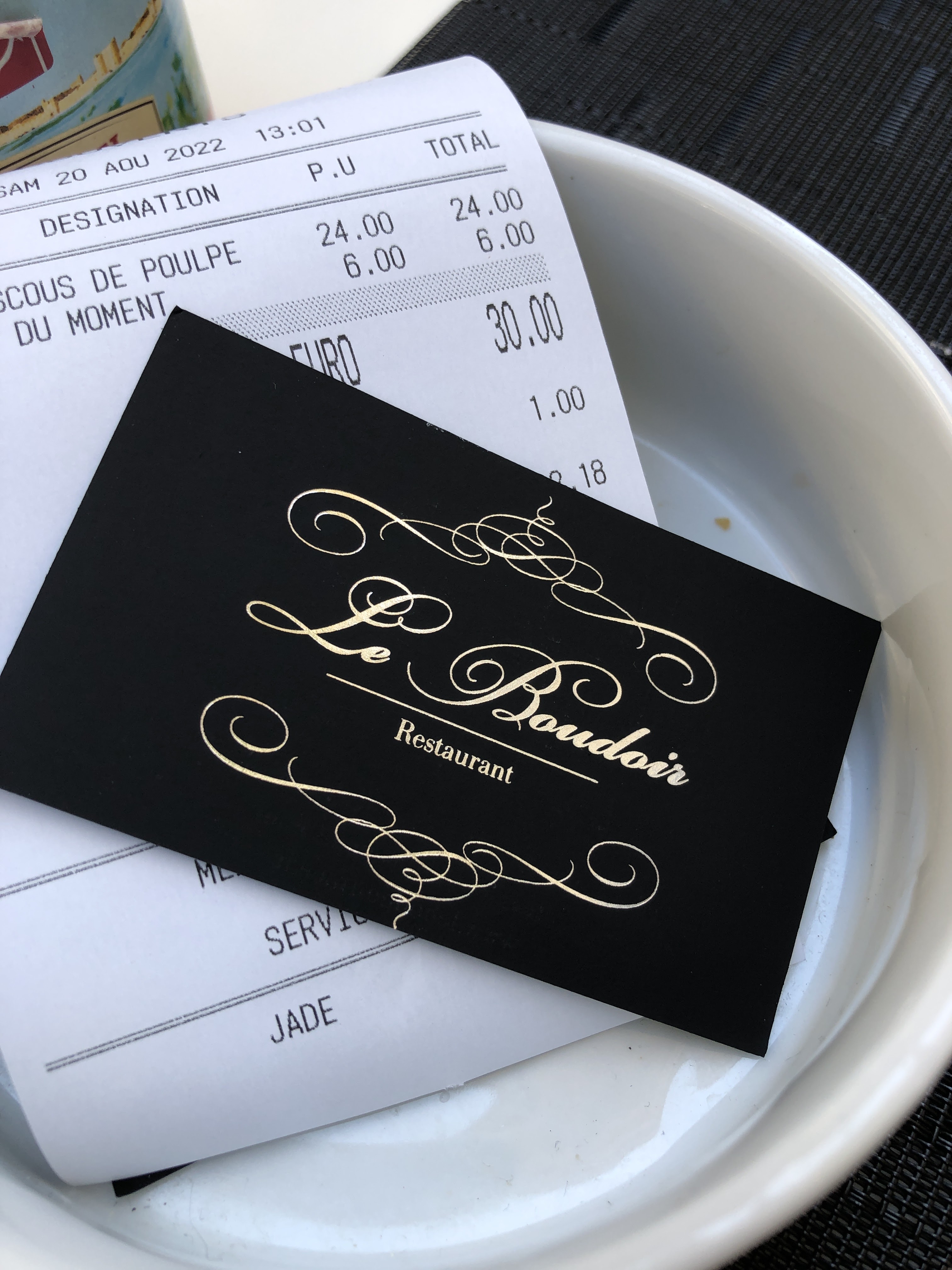Posté le 28/07/2022 à 19:10"Encore un très bon moment au Boudoir. On a profité de la terrasse provisoire (ouverte pendant tout l’été les vendredi et samedi pour déjeuner et dîner). On a testé la carte d’été : dont salade d’artichauts/parmesan/truffe d’été, et un excellent couscous au poulpe et bisque terre et mer ! Très bon accueil, excellent rapport qualité prix. À tester en toutes saison !"