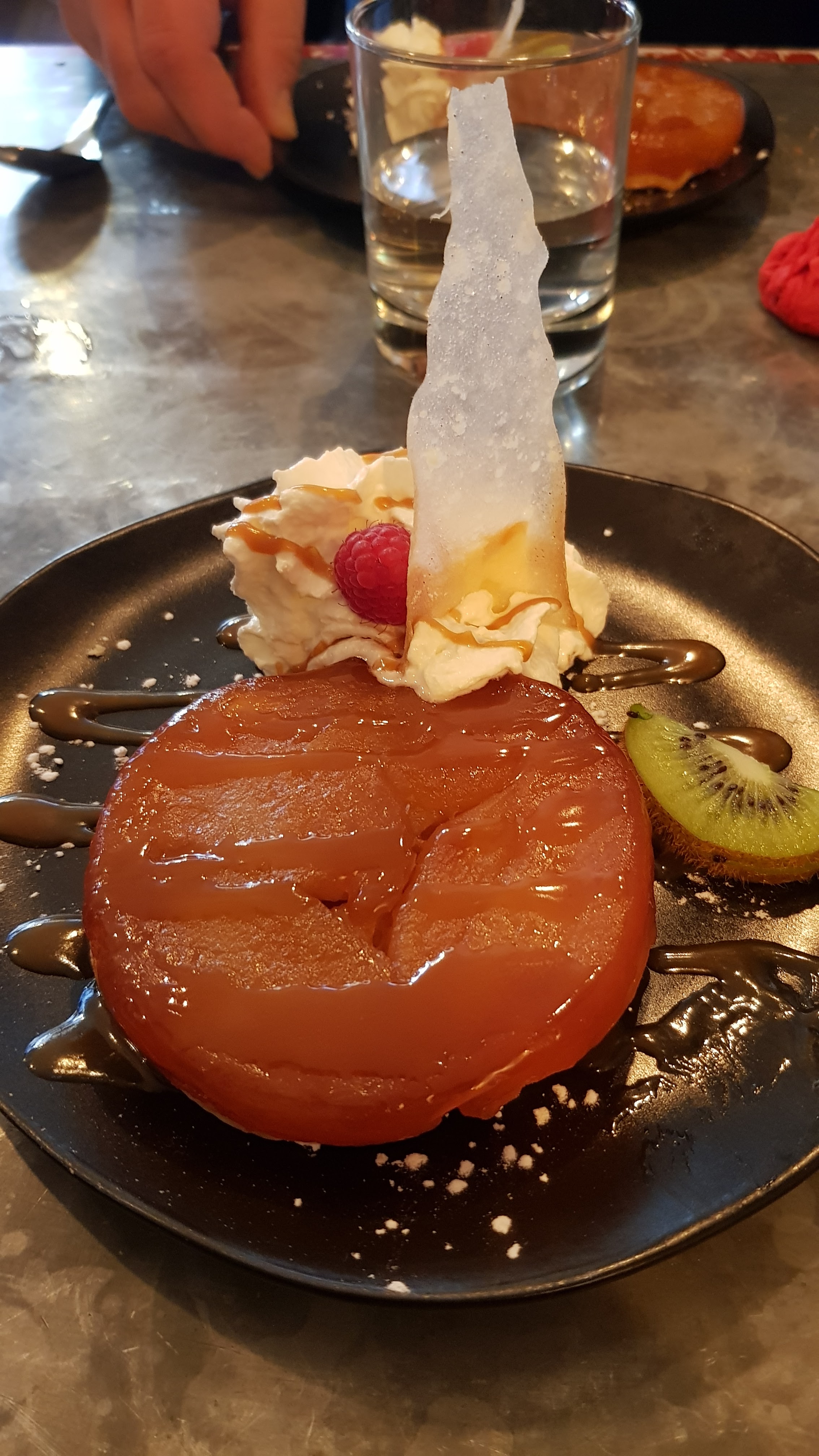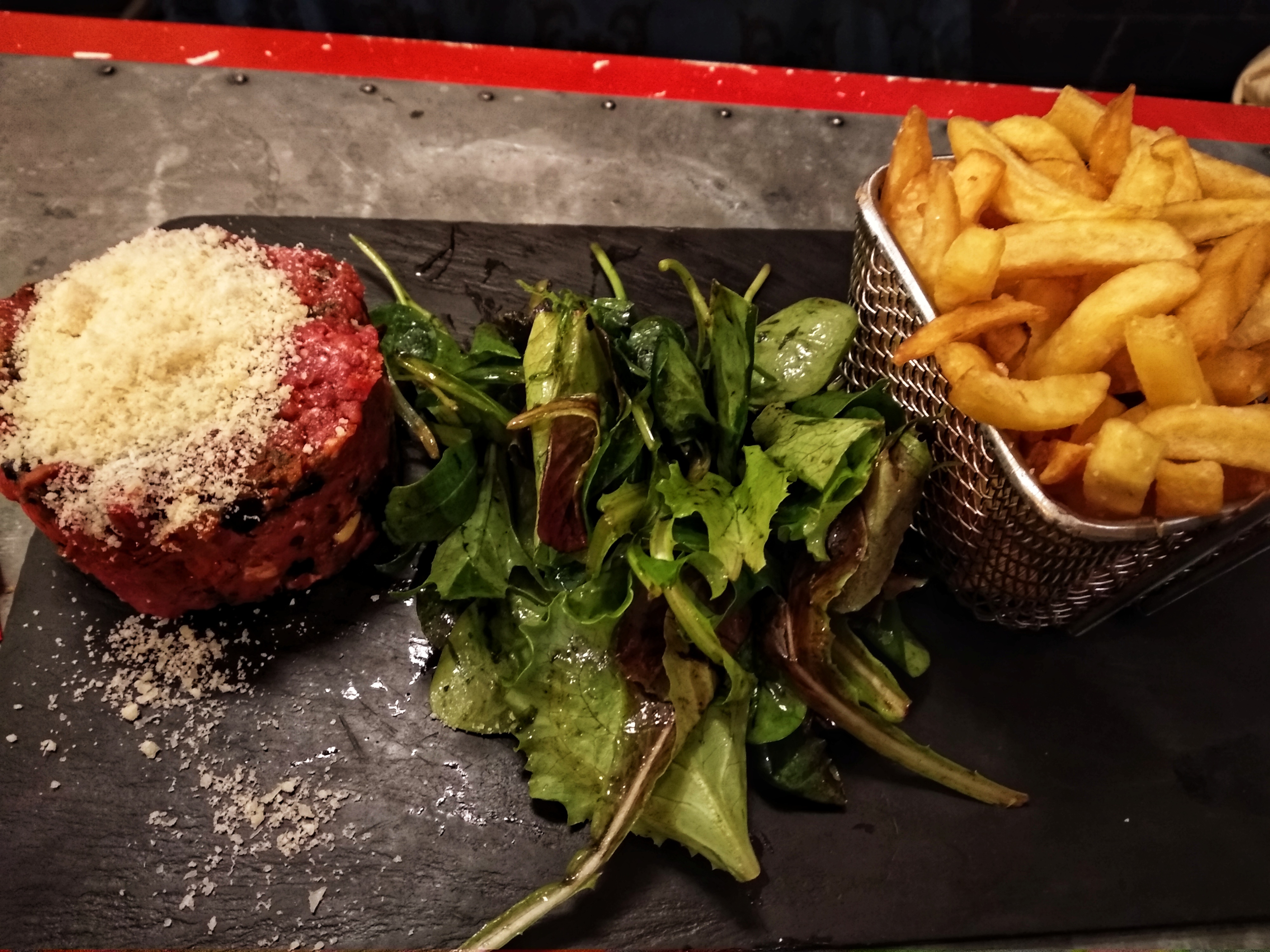 Le restaurant est plein le soir, après 20h il est difficile d'avoir une table (j'y étais mi-août). Le tartare de bœuf était très bien réalisé, mais il manquait une petite pincée de sel. Un petit reproche : le steak black angus avec frites n'a pas répondu à nos attentes. Le dessert (vous pouvez le voir sur la photo ci-dessous) était superbe, les serveurs sympathiques.