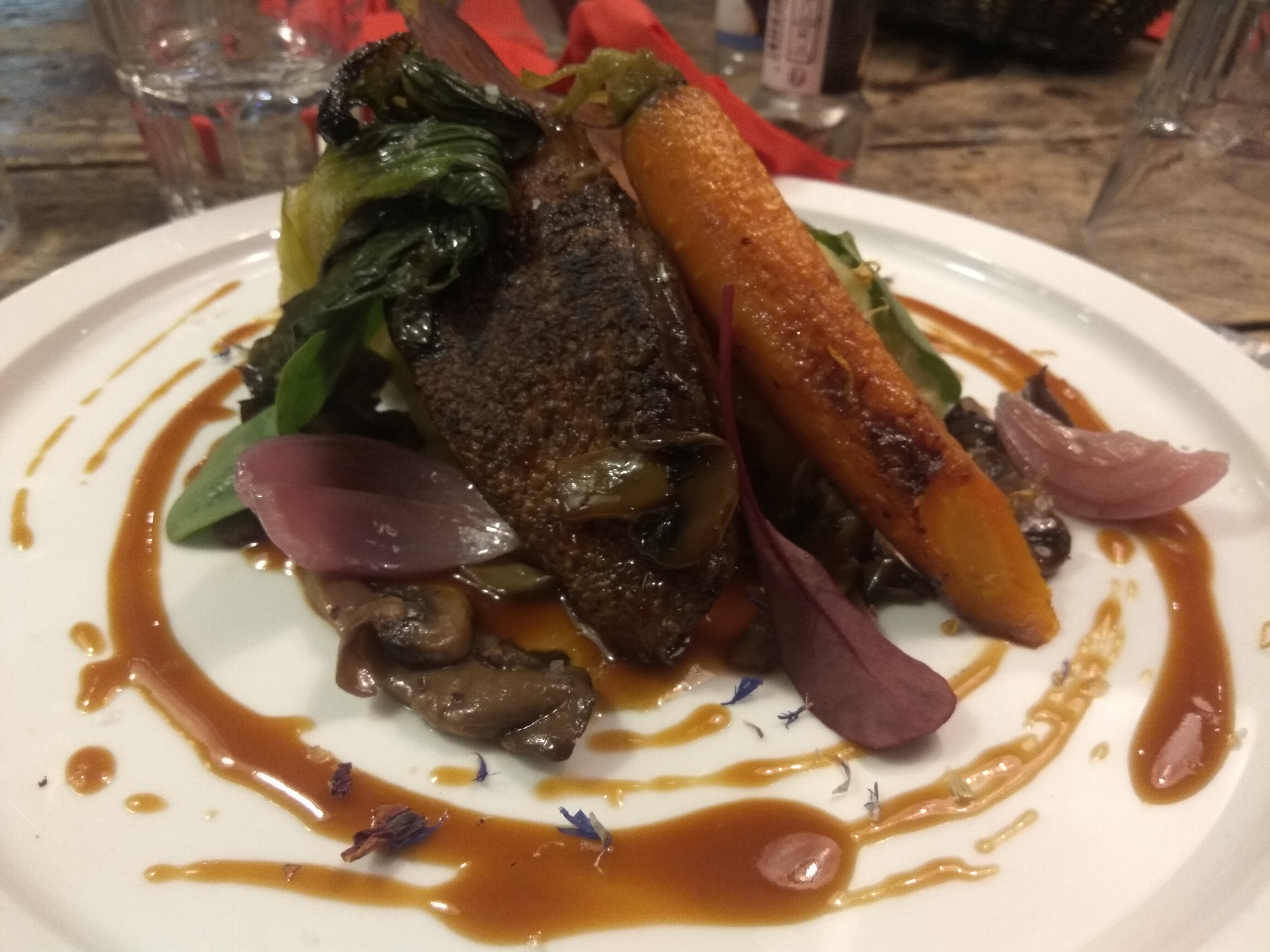 Je ne sais pas vraiment quel est le battage médiatique autour de cet endroit, mais j'ai décidé de tenter ma chance après avoir lu toutes les critiques élogieuses sur cet endroit. Honnêtement, je ne peux être d'accord qu'avec une seule des critiques, à propos du saumon presque congelé (je pense que c'est très évident d'après la photo que j'ai prise), probablement tout droit sorti d'une boîte, qui accompagnait le fromage de chèvre. Le canard était trop cuit, difficile à couper et avait un goût de caoutchouc. Je ne sais pas d'où la personne qui a écrit sur les saveurs complexes de la nourriture a trouvé son inspiration - peut-être que tout cela vient de son imagination. C'est vraiment plus un raté qu'un coup, à mon avis. Du côté positif, les serveurs étaient plutôt sympathiques.