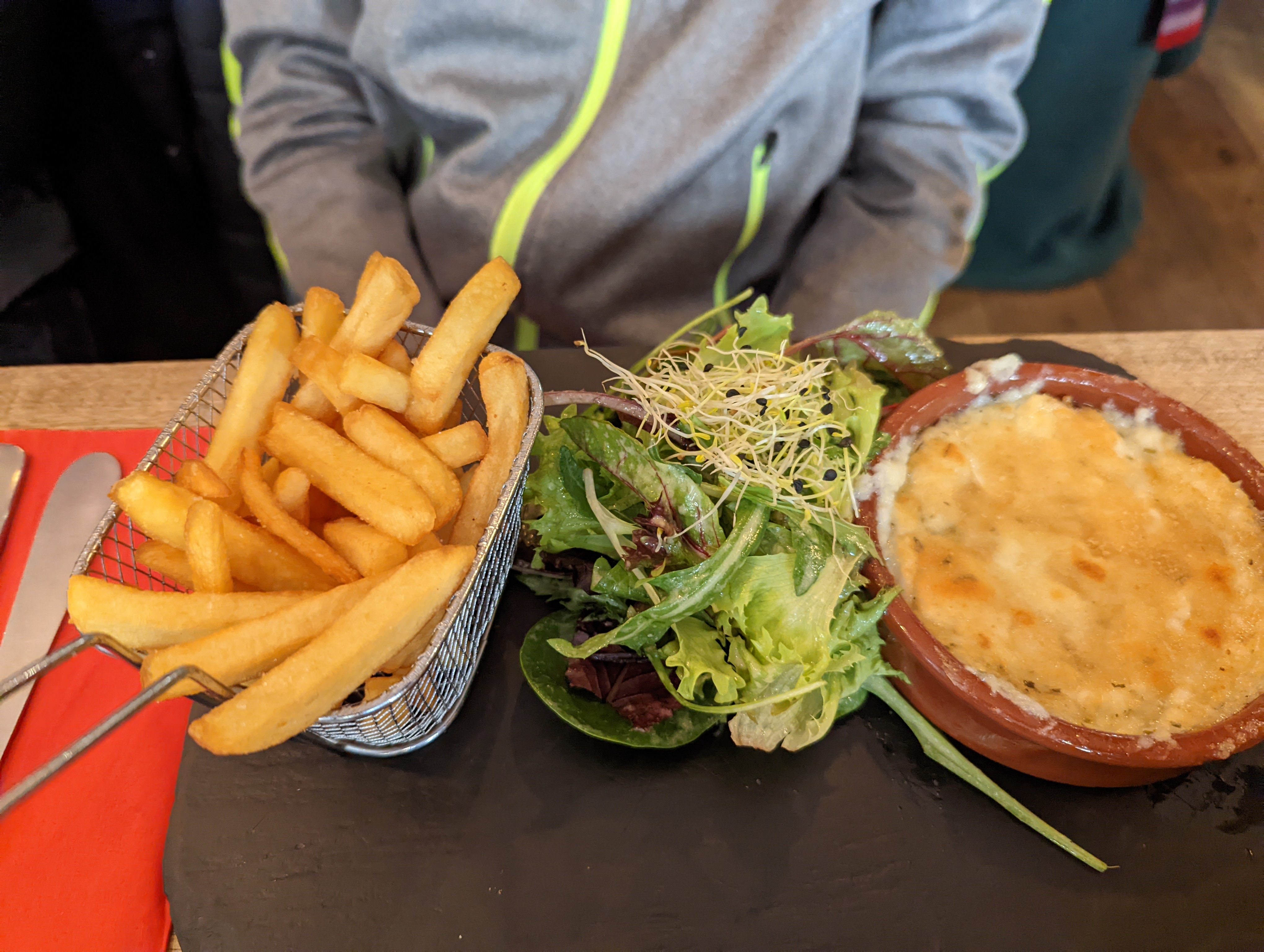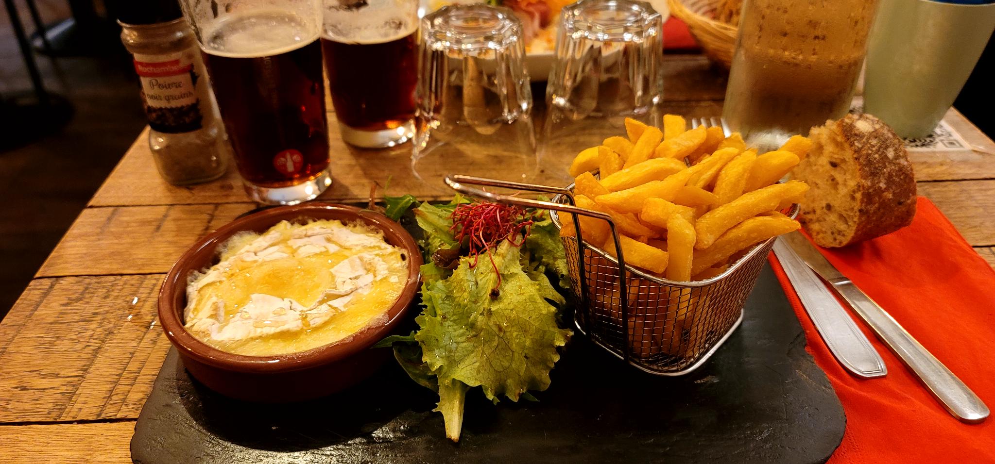 Bon que dire... Bon accueil, le service très efficace, les plats bons rapports qualité prix. (A éviter le camembert rôti qui s'est révélé être un demi camembert au lait pasteurisé donc résultat une pâte cuite... une feta est aussi bonne voir meilleure, des frites maison aussi c'est bon mais c'est pas le cas ici. Cf. Photo) A prendre en compte: Trop rapide mais vraiment beaucoup trop, ce n'était pas un moment de détente. Ne pensez pas prendre d'apéritif c'est prohibé apparemment (si vous aimez l'apéritif avec votre entrée/plat c'est bien) Pour un fast repas c'est top. Malheureusement déçus... Pas a fuir mais sachez ce qu'il vous attend au regard de notre expérience.