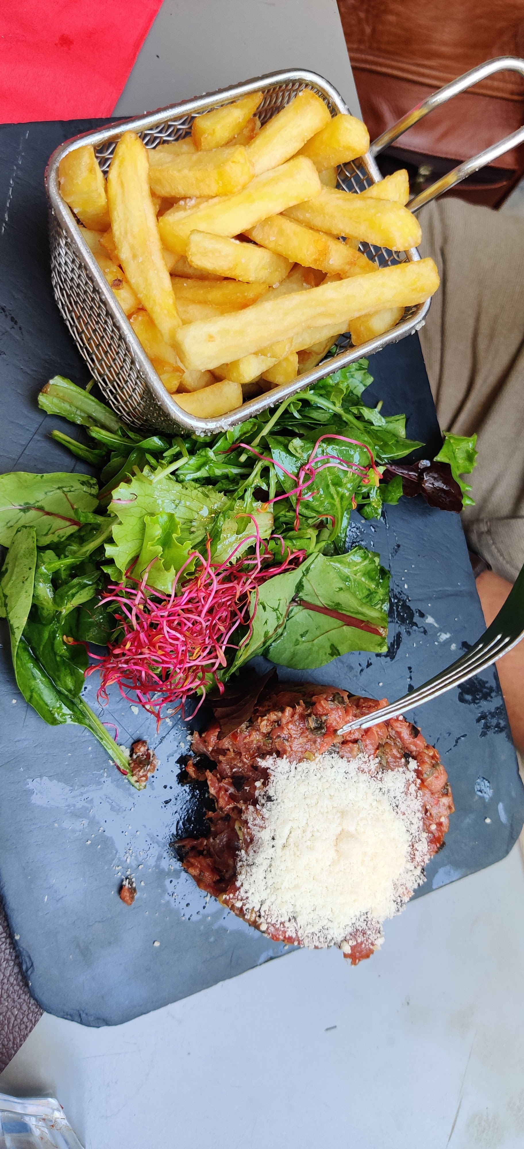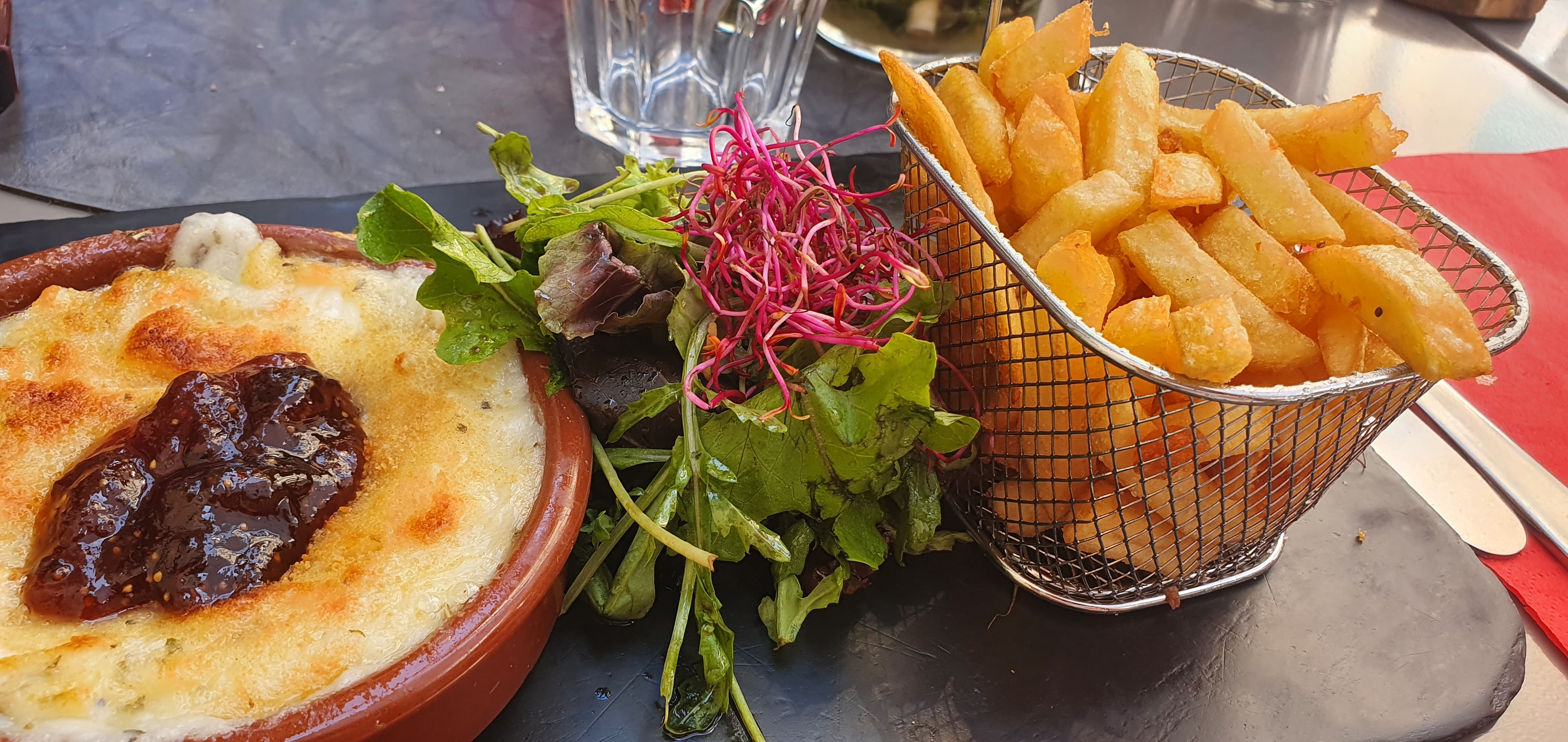 Euh... on nous a recommande ce restaurant a notre hôtel. Produits frais, note de 4.4 nous y allons confiant... Menu bistrot, steack tartare, camembert roti, gratin de chèvre, rien de très exitant...95 % des plats sont servis avec des frites...bof... Les plats sont très petits, et les frites infames...de la frite bas de gamme congelée de chez metro.... Bref les plats sont comestibles , mais rien ne justifie une note de 4.4. Et pour le service, c est idem...