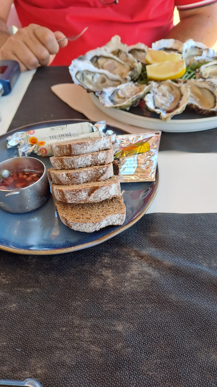 Posté le 15/07/2023 à 08:09"Arrivé avec 15mn de retard on a prévenu l'établissement qui a compris. Parcontre service ultra long ( serveur génial et rigolo heureusement ) on a fini à 22h15 alors qu'on c'est mis à table à 19h30 tous ensemble car nous étions 6 adultes et un enfant et on est arrivé ensemble. De plus j'ai fais une forte intoxication à vos huîtres il serait nécessaire de vérifier la FRAÎCHEUR, en juillet c'est risqué je sais mais l'envie a été plus forte que la raison. Dommage j'aurais du éviter. Le patron un peu bizarre quand on veut payer l'addition en divisant simplement en 3 apparemment cela ne lui convient pas mais on est 3 couples donc comment on fait ? De plus pardon mais vos chaises blanche une catastrophe on a tous mal au dos pourtant on est pas si vieux.c'est un super cadre avec une bonne cuisine mais du coup c'est un flop pour nous."