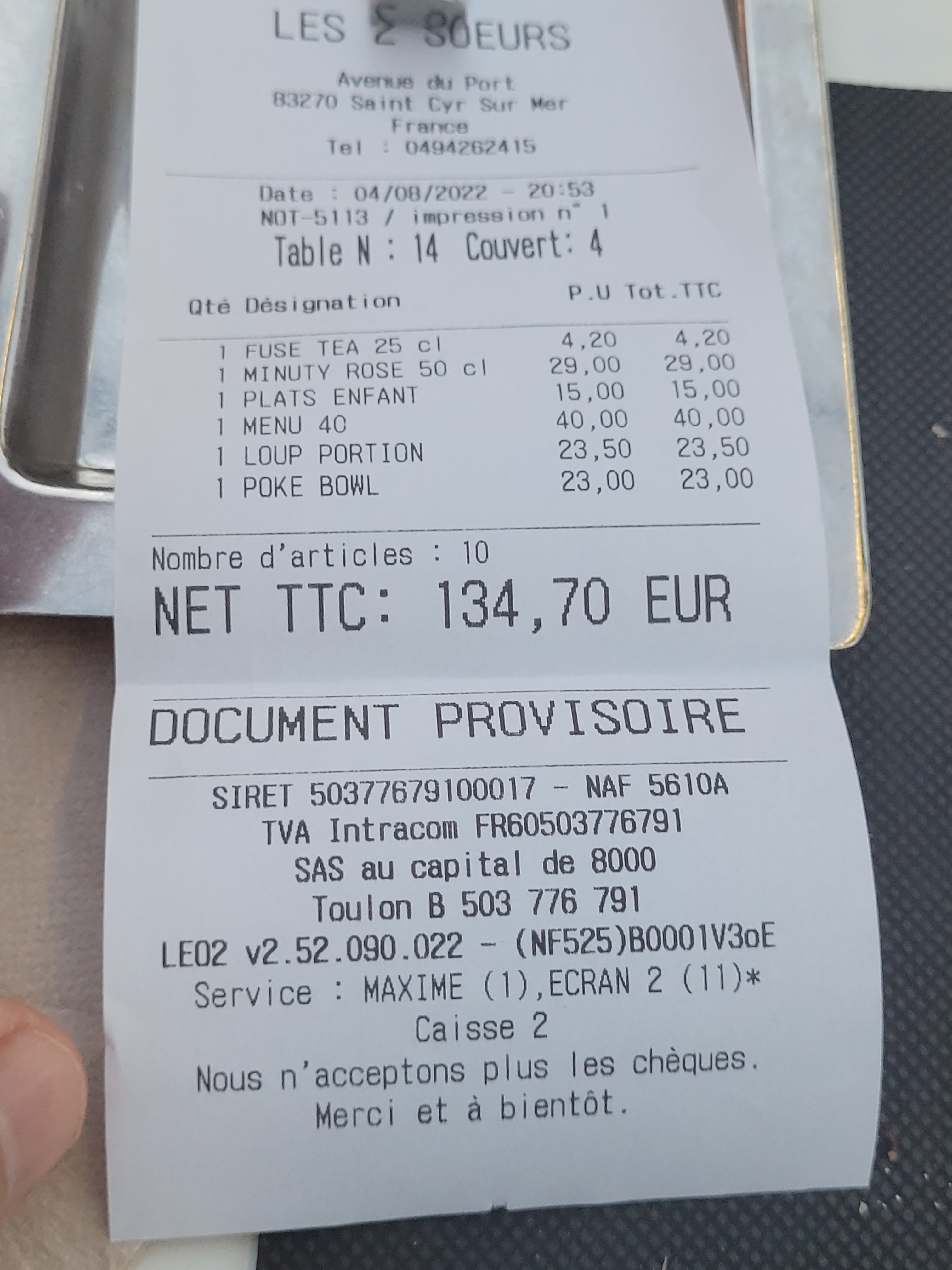 Posté le 08/05/2023 à 07:54"Nous avions l'habitude d'aller manger Aux 2 sœurs régulièrement et là, nous avons découvert une carte complètement différente avec des tarifs à la hausse+++ mais, c'était très bon donc, sûrement l'inflation 😜🤭"