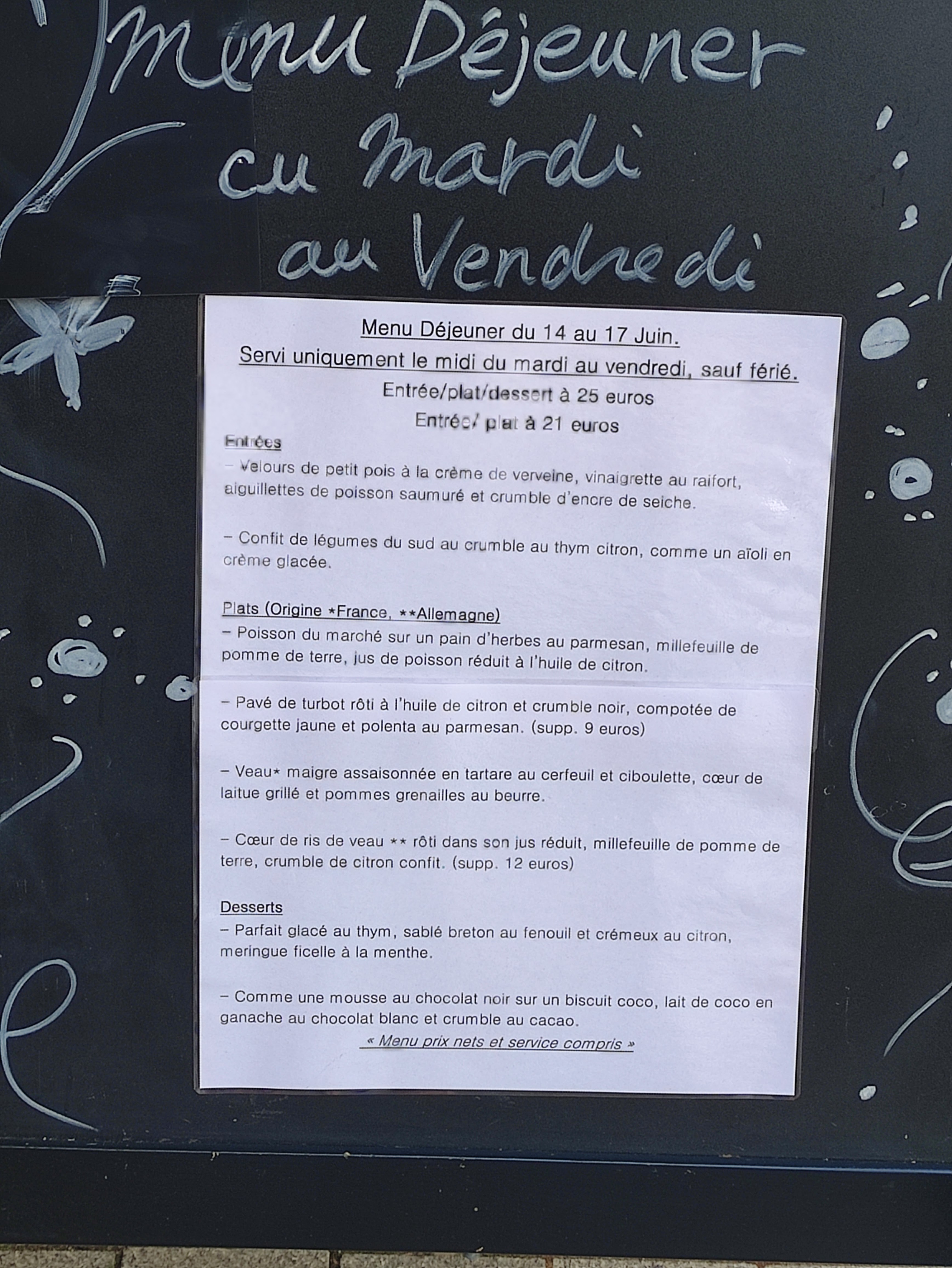 Rien à redire. Une très bonne cuisine pour un prix très abordable. La gentillesse de la patronne est agréable et il y a quelques pépites sur la carte des vins. Je recommande.