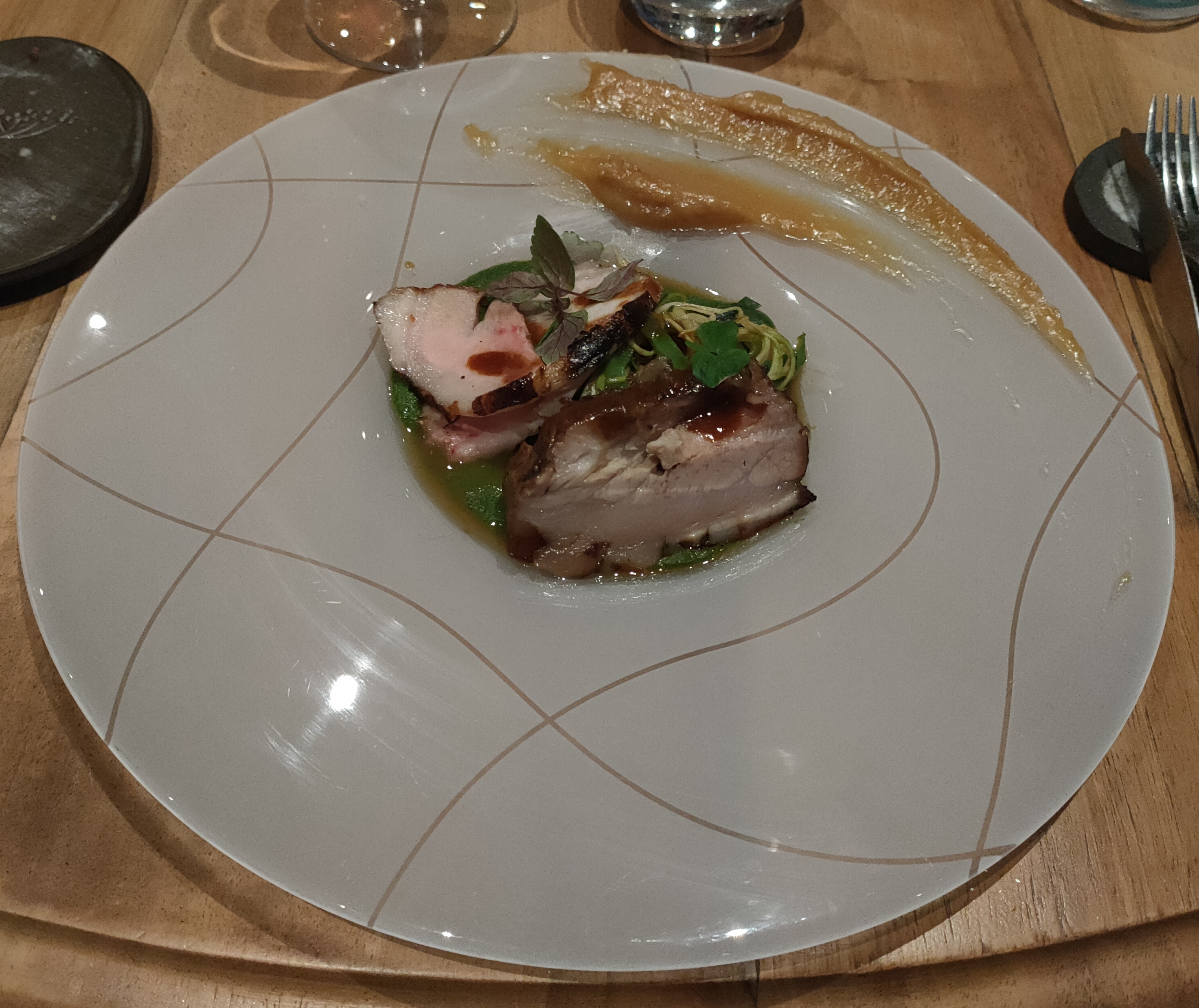 Pas convaincu par les explications, notamment des vins. Trop de saveurs Je me suis perdu. 2 menus ( poisson et porc) et 1 végétarien