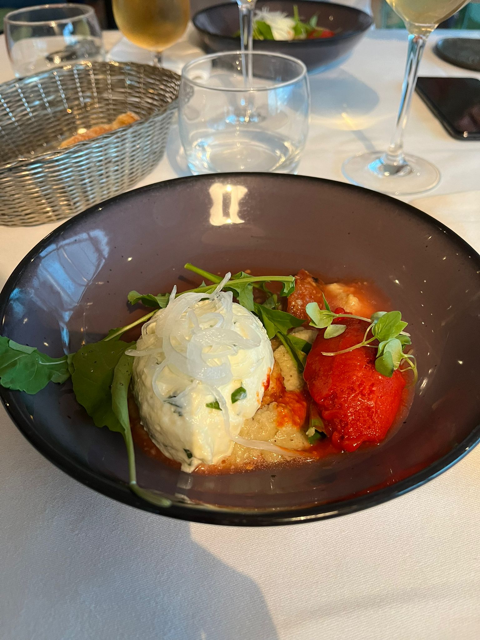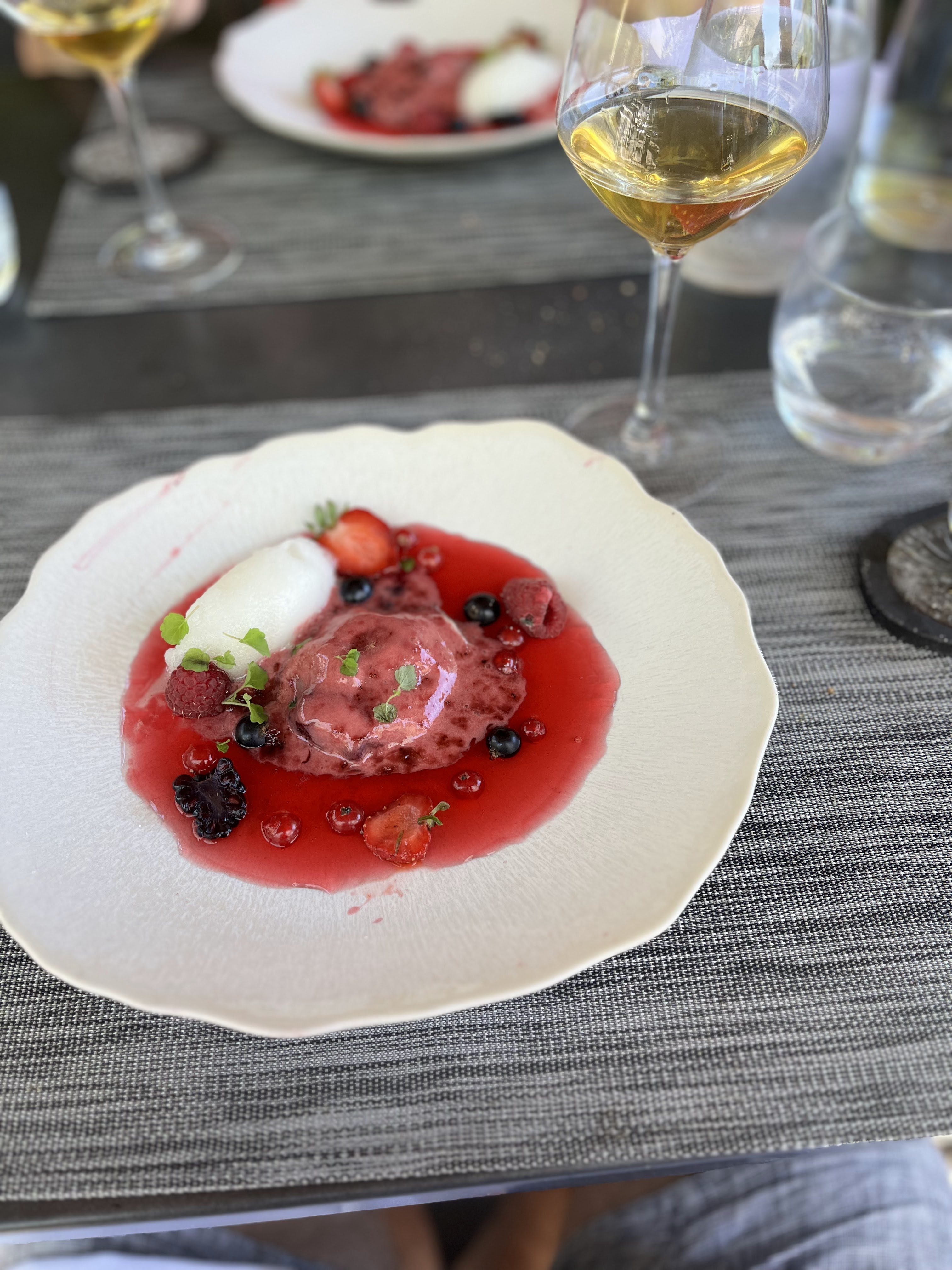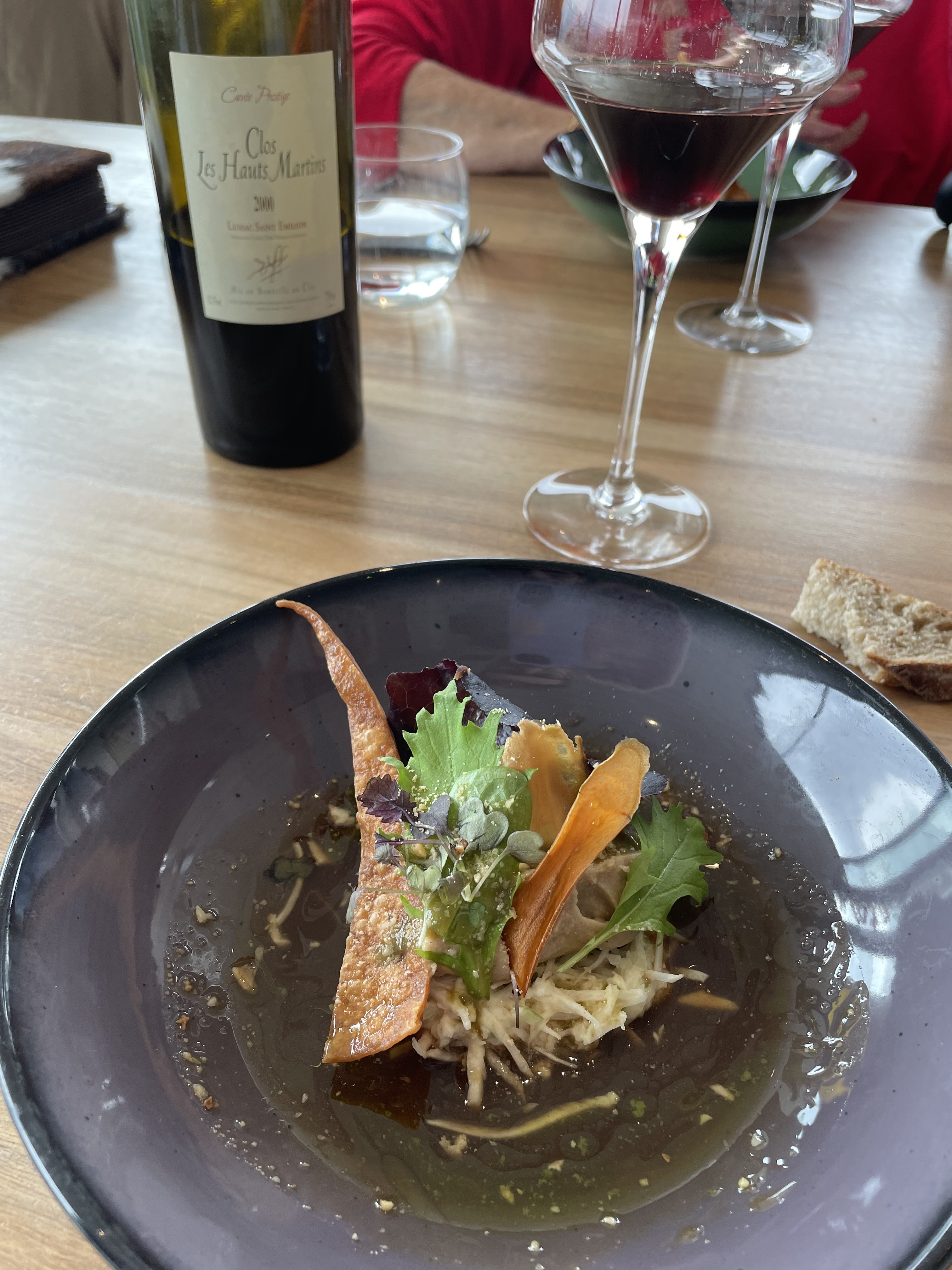 Excellent service, vue imprenable sur les Alpes et la vallée de Grenoble et superbes vins bio (bio-dynamiques) originaux. Leur menu surprise (vous pouvez indiquer vos allergies et intolérances avant de le préparer) peut aller d'un simple (mais délicieux) repas de 4 plats à un menu dégustation plus copieux de 9 assiettes (ils précisent que les portions sont plus petites pour celui-ci). Nous avons commandé le repas de 4 plats avec l'accord mets et vins et ce fut l'une de nos meilleures expériences culinaires jusqu'à présent ! Nous y sommes allés la nuit de l'éclipse de lune et nous avons été tellement captivés par notre nourriture que nous avons raté l'éclipse... 😳 Je ne sais pas si nous avons eu de la chance, mais ils nous ont apporté un deuxième dessert !